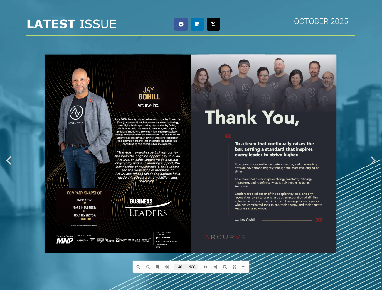 The highlighted deliverables from this project include a magazine spread for Business in Calgary’s magazine for the 2025 Leaders Awards, a t-shirt design for the 2025 Arcurve BBQ, and a collection of reusable icons for presentations and documents. Each piece was developed to align with Arcurve’s brand identity, maintaining consistency across both print and digital platforms. The focus was on creating adaptable, cohesive visuals that could be integrated into ongoing marketing and event materials.