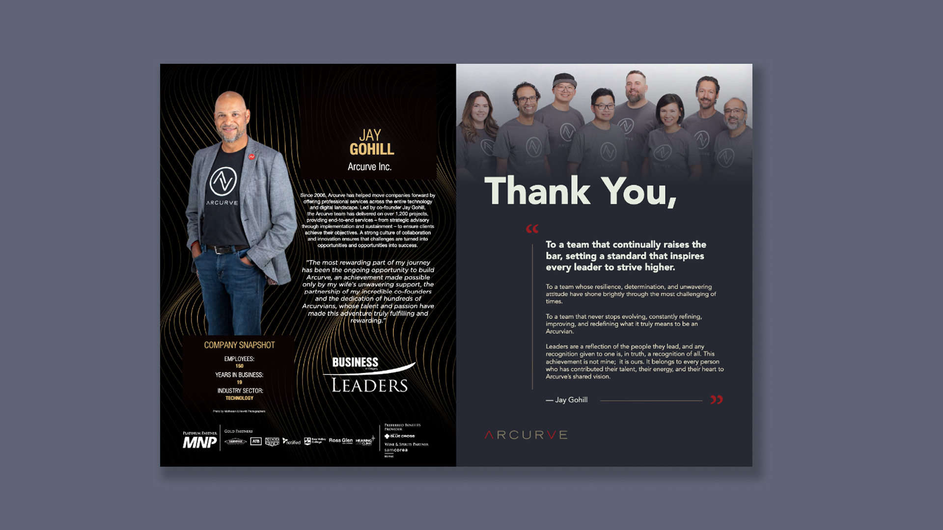 This real-world project provided Arcurve with cohesive event collateral and a unified iconography system that can be reused across future print and digital materials. The event graphics supported a special company milestone, while the magazine spread offered a polished public-facing asset aligned with Arcurve’s professional branding. These pieces streamline future content creation and reinforce consistency across platforms.