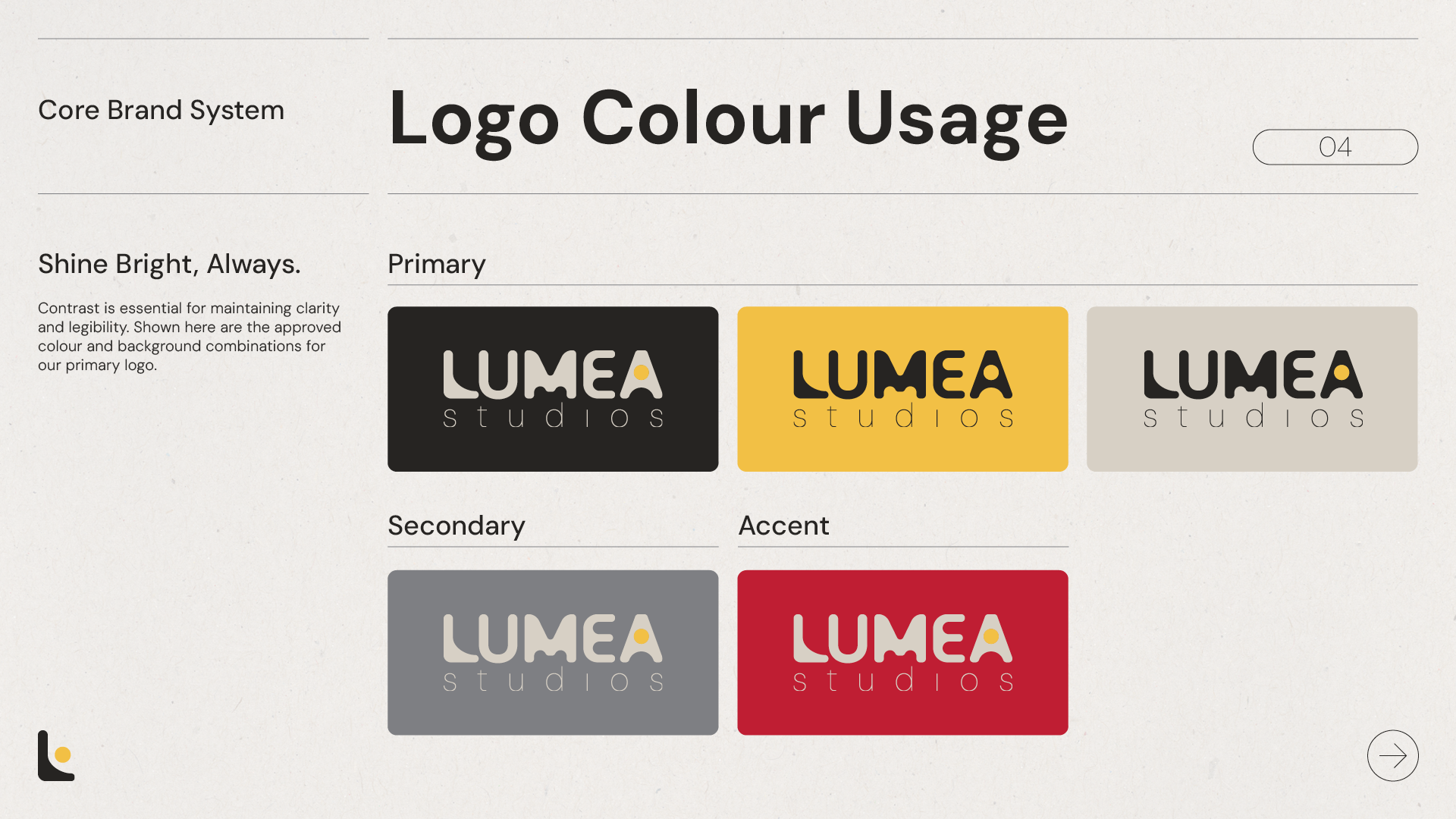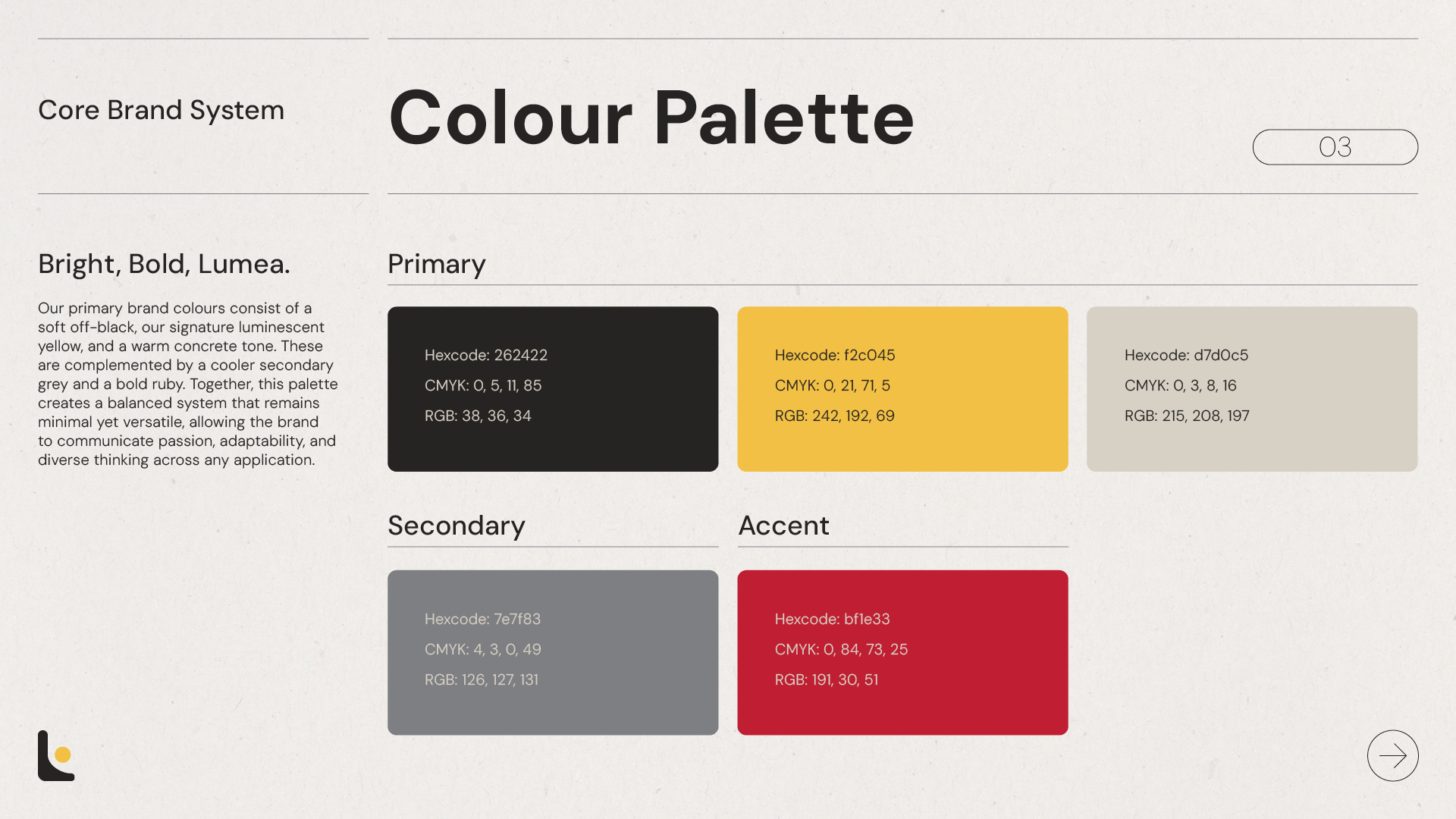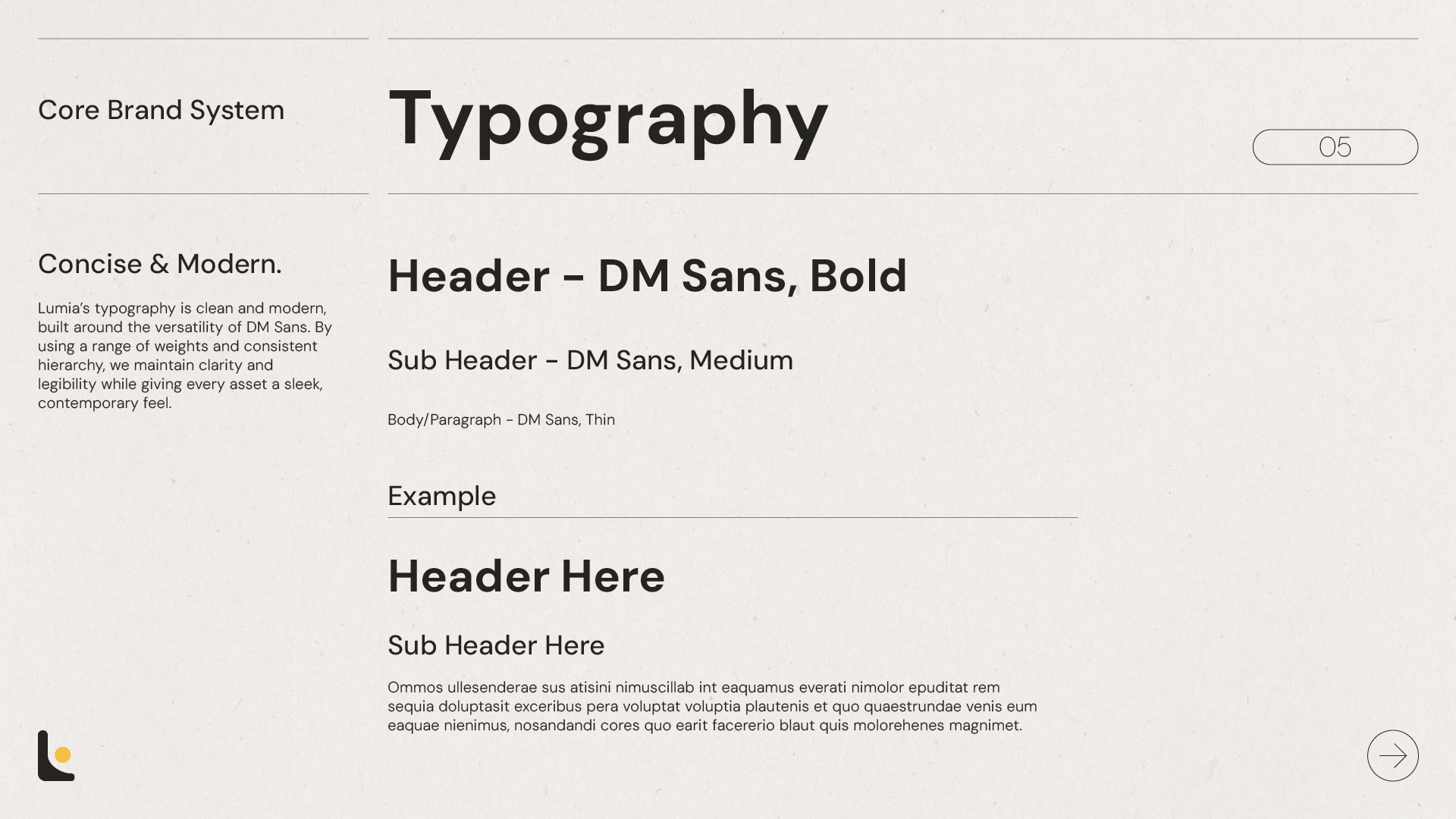 Lumia Studios’ branding balances minimalism with warmth, using a palette of luminescent yellow, rich crimson, warm concrete, and soft off-black to create a clean yet expressive visual identity. The focus on lighting and contrast reinforces the studio’s mission to illuminate ideas and bring clarity to every project. DM Sans serves as the primary typeface, supporting a modern, approachable tone across both digital and static applications.
