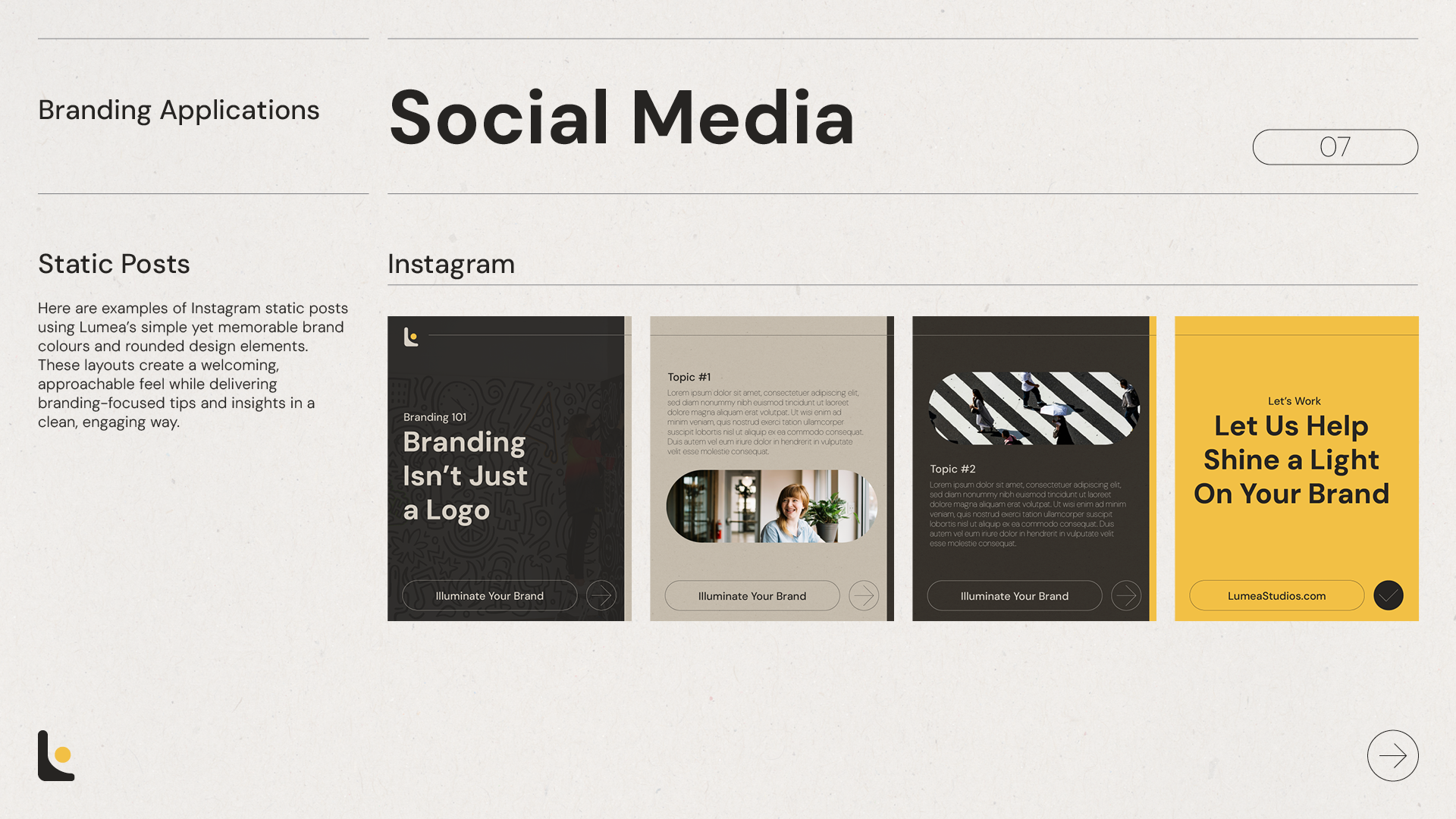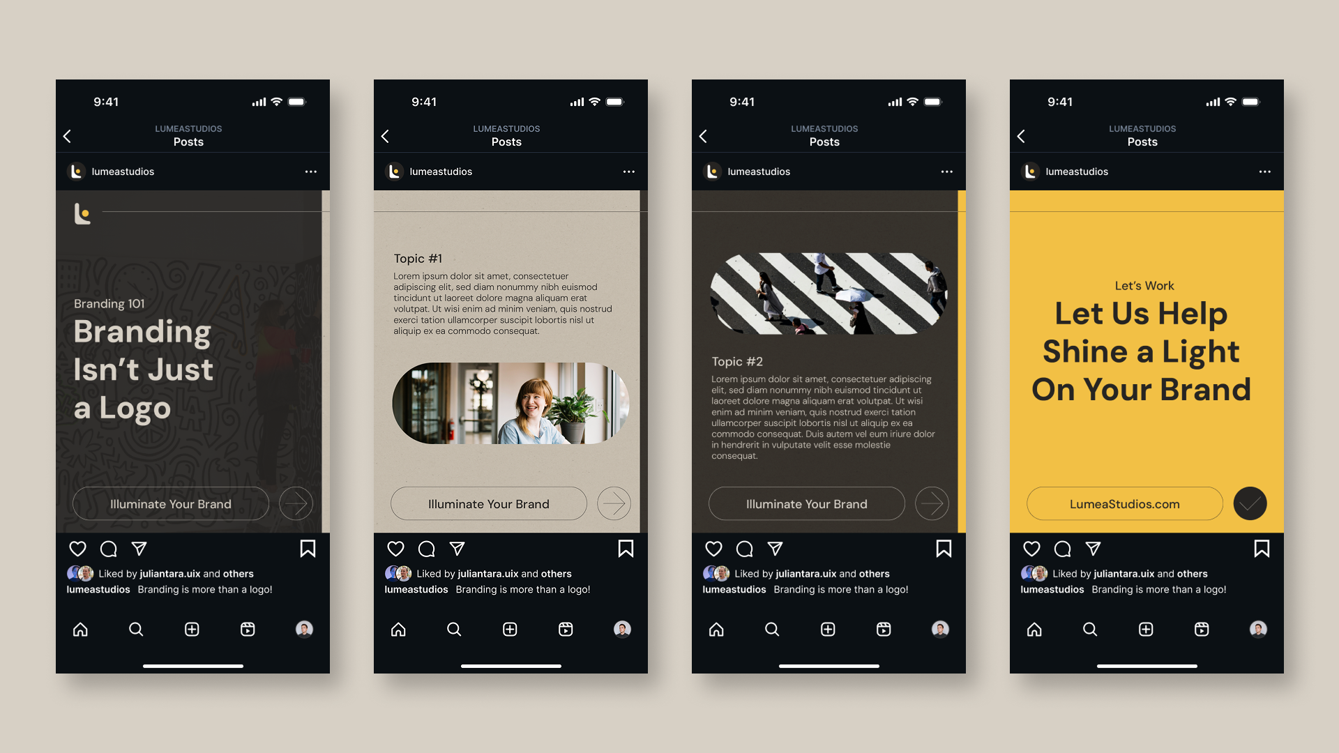 The final deliverables establish a clear and consistent visual identity that strengthens Lumea Studios’ presence across digital touchpoints. The brand guideline provides a structured foundation for future work, ensuring cohesive use of colour, typography, and visual elements. The logo animation adds movement and character, enhancing brand recognition and bringing the studio’s focus on illumination to life. The Instagram posts demonstrate how the identity translates into approachable, memorable content, supporting a strong and unified brand experience.