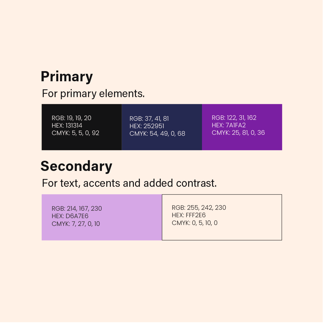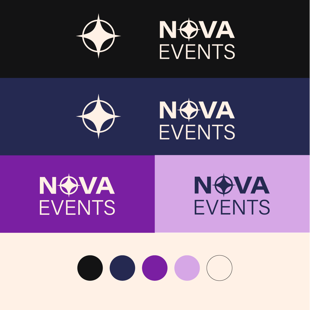 Nova Events’ identity uses a deep off-black foundation, paired with vibrant purples and rich navy tones, to capture a futuristic, creative atmosphere. This palette evokes the feeling of a darkened theatre, the stage lights rising, the event beginning. Typography and layout choices emphasise structure, clarity, and forward-thinking design, allowing the brand to feel both professional and imaginative. The system is intentionally adaptable, supporting events of all types.
