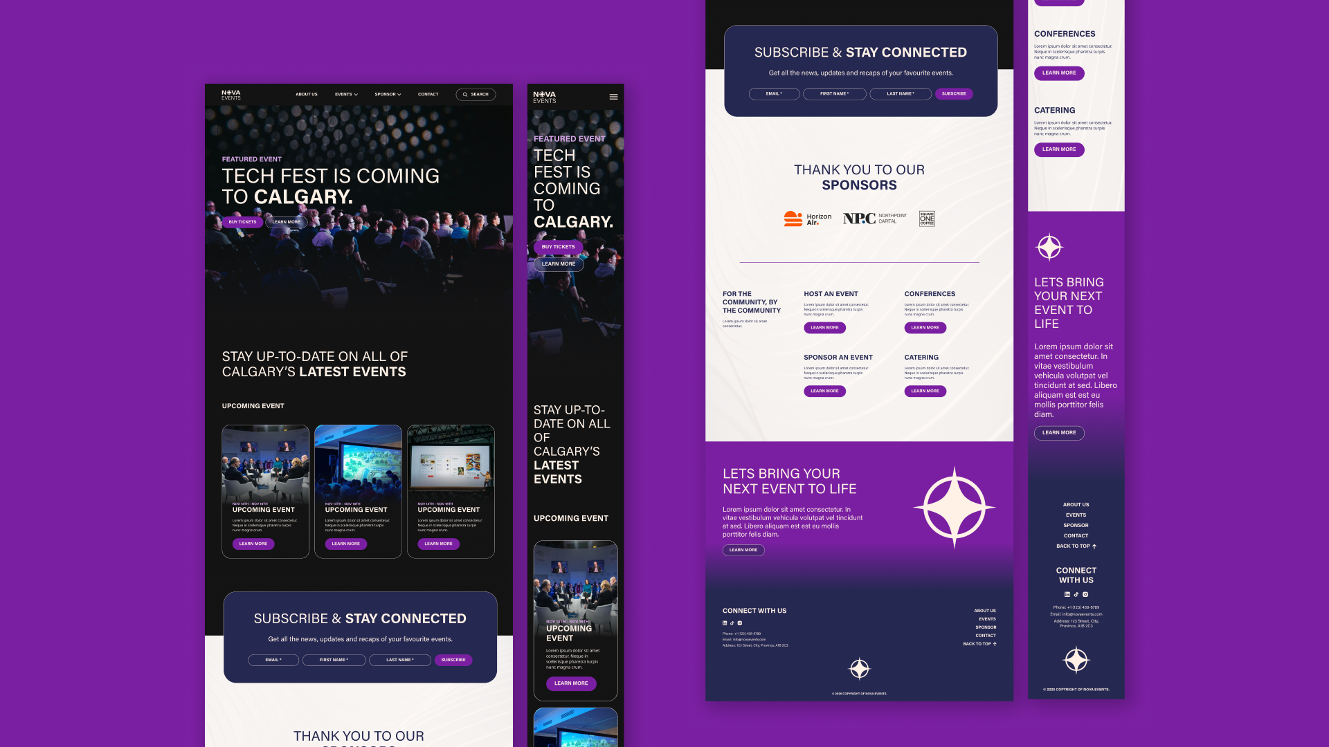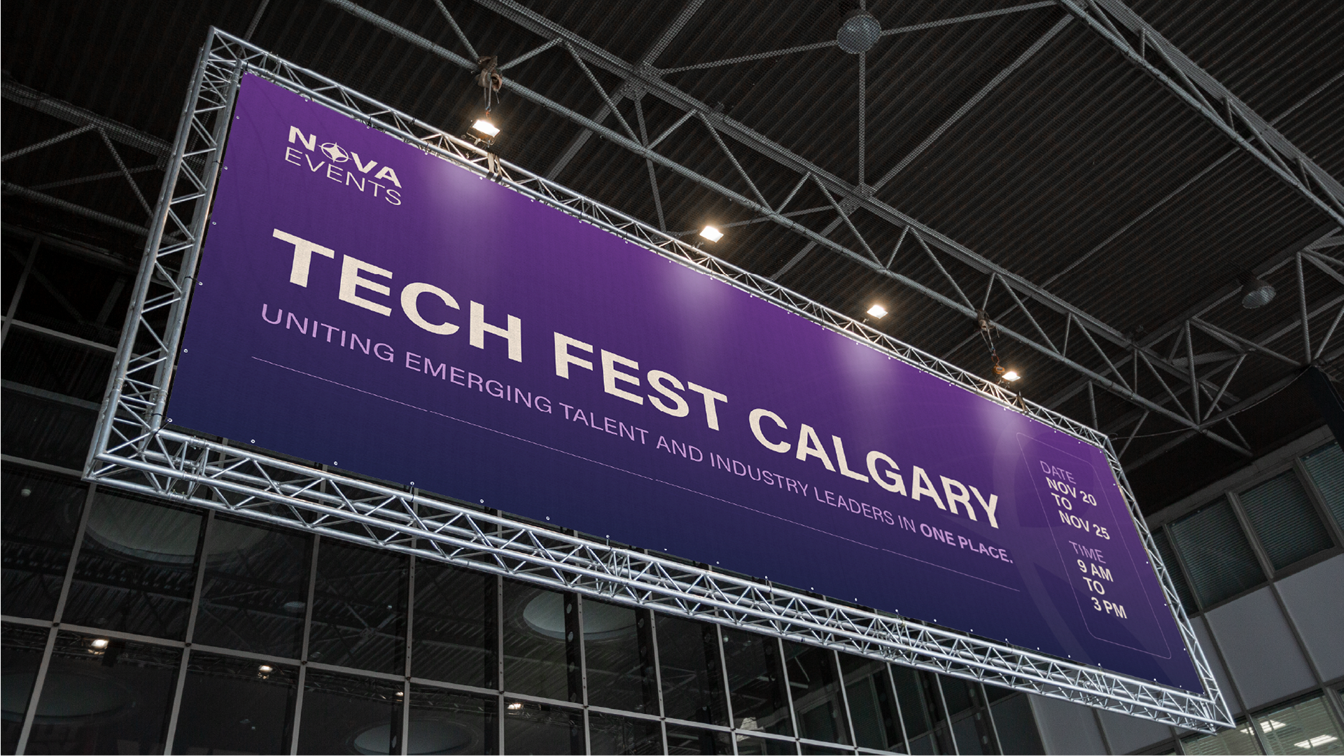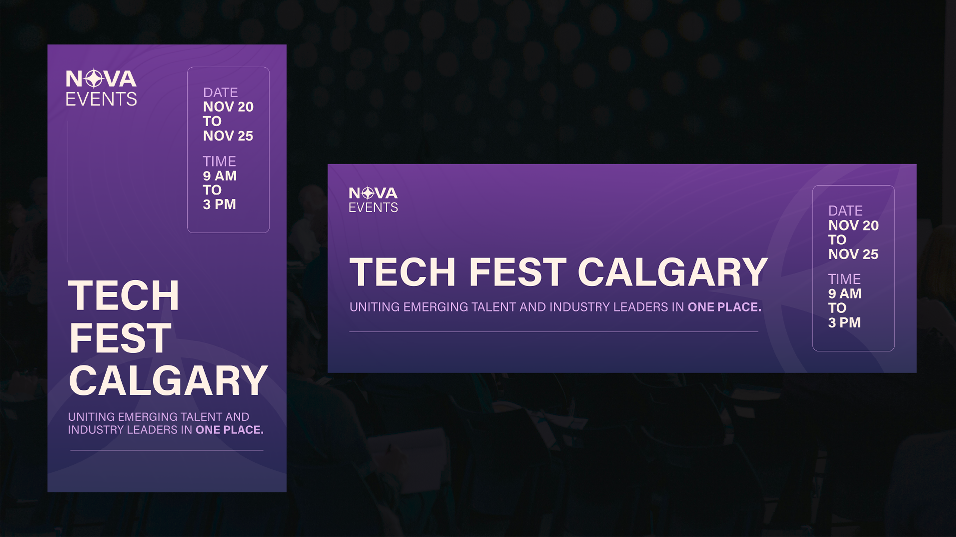 Nova Events is the conceptual in-house event planning and marketing team for the Nova Centre, a venue that hosts technology-focused and creative industry gatherings. Their branding draws from theatrical lighting and futuristic colour palettes.
