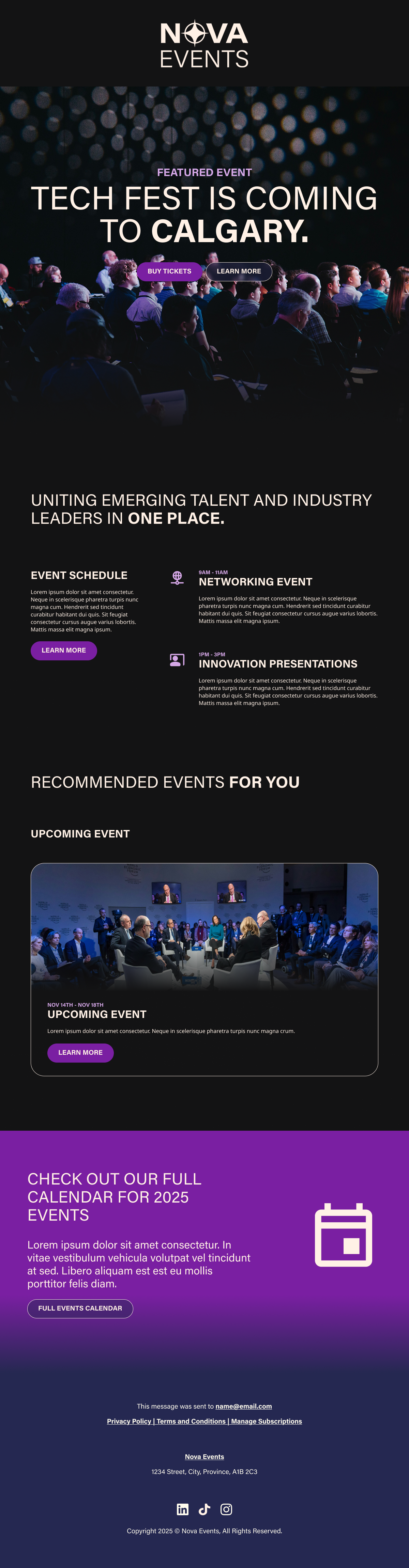 This project provides Nova Events with a cohesive digital system that supports user engagement and recognisability. The email template includes personalised event recommendations based on user activity, while the landing page and signage maintain consistent visual themes. This strengthens brand recall and helps create a streamlined experience for attendees across digital and in-person environments.